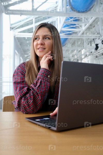 Портрет молодой красивой женщины-фрилансера, работающей с ноутбуком. Концепция фриланса и удаленной работы. Рабочие процессы заставляют гибрид работать, работать. Цифровая женщина и социальные сети