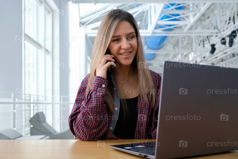 Молодая брюнетка разговаривает по смартфону и работает на ноутбуке. Концепция фриланса. Удаленная работа. Счастливая женщина-девушка, работающая удаленно. Женщина звонит по смартфону