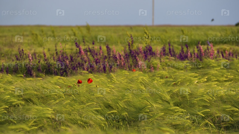 Зеленое зерновое поле с красными маками и расфокусированными разноцветными цветами люпина на фоне неба. Мягкий фокус