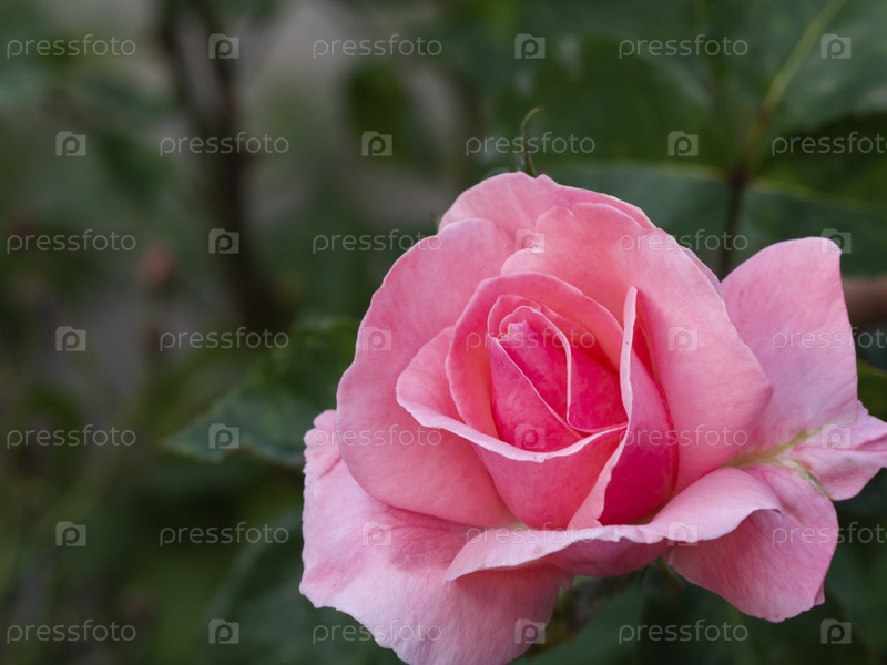 Красивая розовая роза в саду на фоне листьев. Крупный план цветка с нежными лепестками в природе, пустое место для текста. Отличная летняя открытка