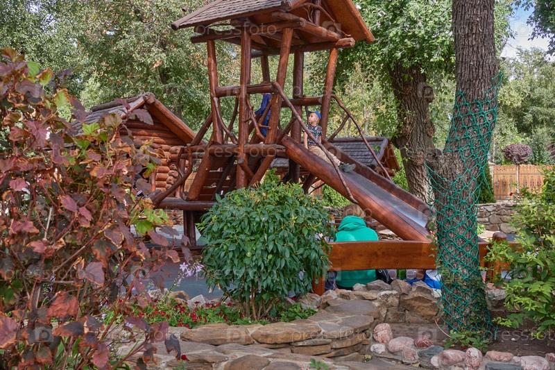 Дети катаются на деревянной горке в осеннем парке. Матери сидят на скамейке и смотрят за сыновьями