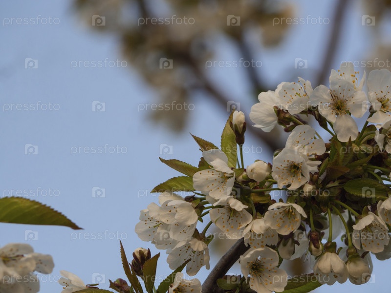 Избирательный фокус красивой белой вишневой ветки на дереве под голубым небом, красивые вишневые цветы весной в саду, цветочный фон природы