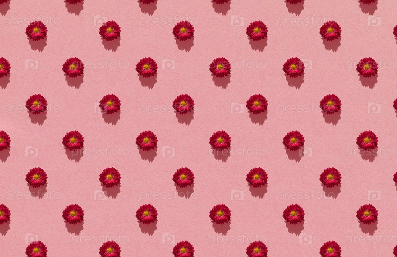 Бесшовный узор из осенних цветов красных хризантем на пастельно-розовом бумажном фоне. Весна, Пасха, летняя цветочная концепция. Плоская планировка, вид сверху. Композиция из цветов