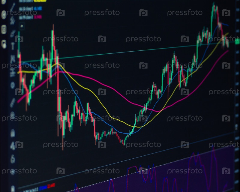 Крупный план финансового графика со свечным графиком и линиями индикатора тренда на фондовом рынке. Концепция финансов и фондовой биржи. Визуализация данных цифровой аналитики онлайн