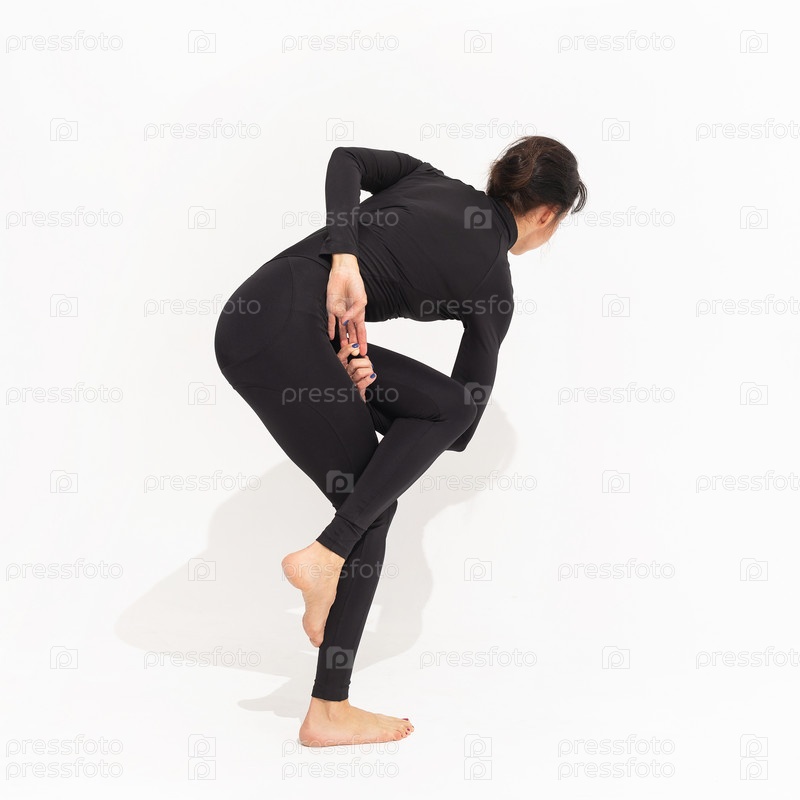 Женщина в черной спортивной одежде практикует йогу, выполняет вариацию упражнения ватаджанасана, поза лошади на белом фоне
