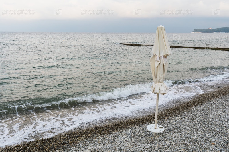 Шторм на море, пустой галечный пляж и закрытый зонтик