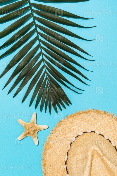 Шляпа, морская звезда и пальмовый лист на фоне синей бумаги, вид сверху