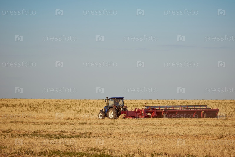 Трактор с прицепной жаткой убирает урожай пшеницы