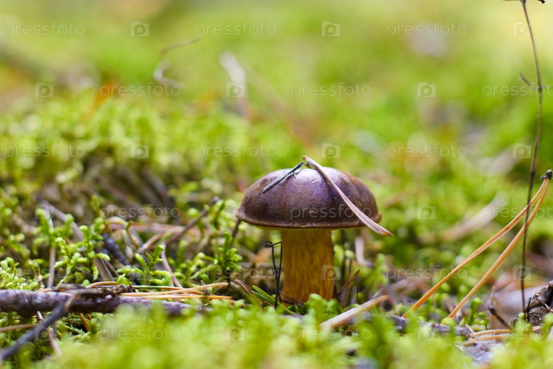 Маленький гриб в сосновом лесу крупным планом