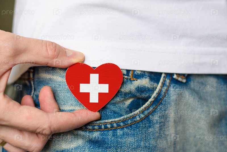 Патриот Швейцарии! Деревянный значок с флагом Швейцарии в форме сердца в мужской руке