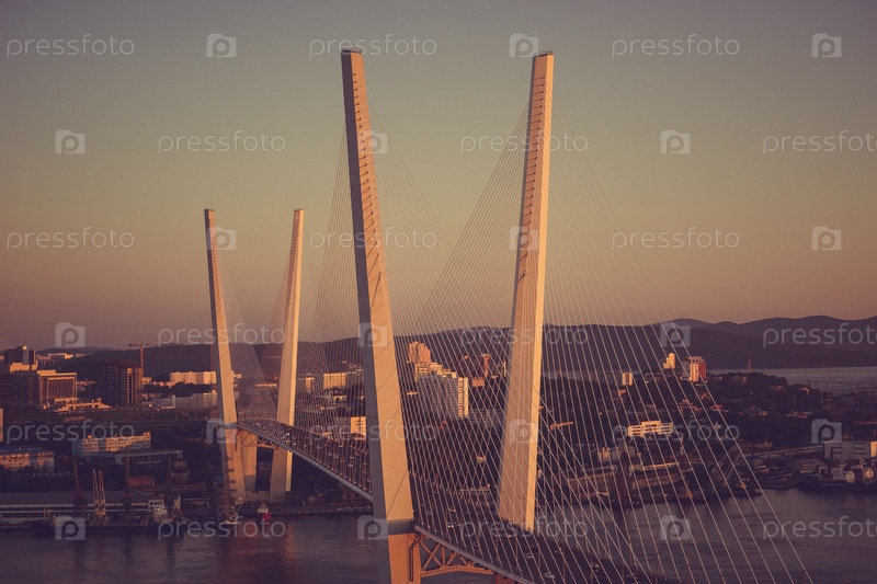 Владивосток, Россия - 29 июля 2018 г.: Ночной вид на мост через Золотой Рог летом