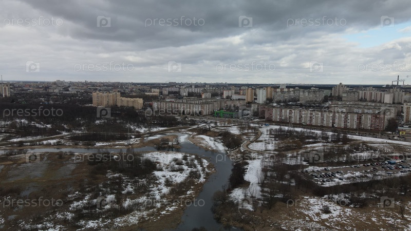 Зимний пейзаж города и реки в снегу в пасмурный день. Извилистая река в городском парке. Пасмурная погода. Аэрофотосъемка