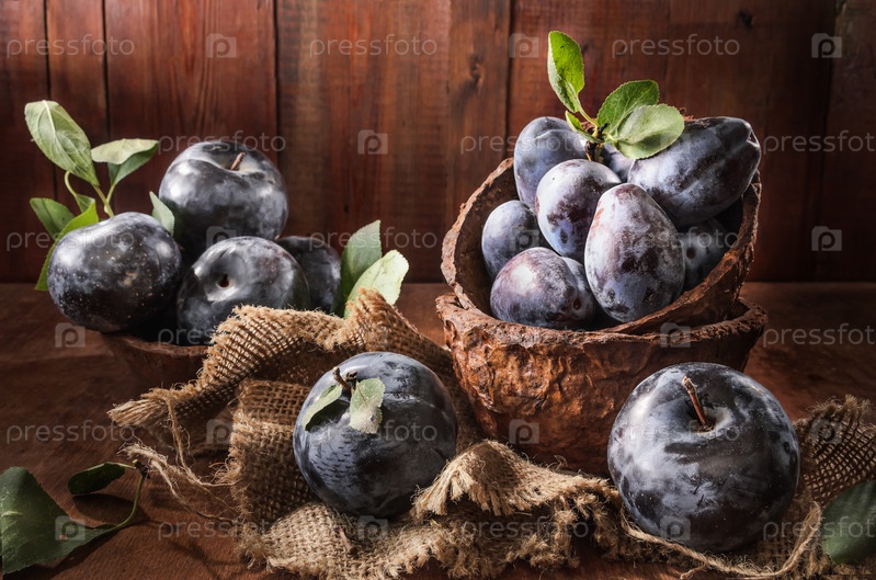 Спелая слива на темном деревянном фоне в деревенском стиле