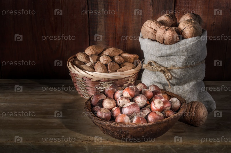 Грецкие орехи на темном деревянном фоне в деревенском стиле