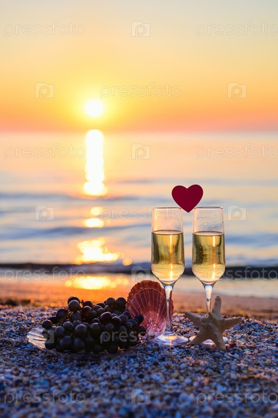 Романтический вечер. Бокалы вина для влюбленной пары на пляже. Селективный фокус на бокале вина, вертикальный формат