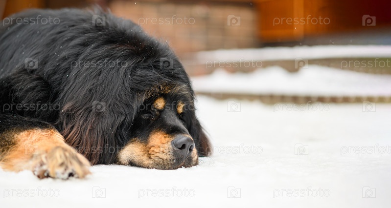 Большая черная собака спит в снегу. Крупный план, выборочный фокус на глазах, пространство для копирования