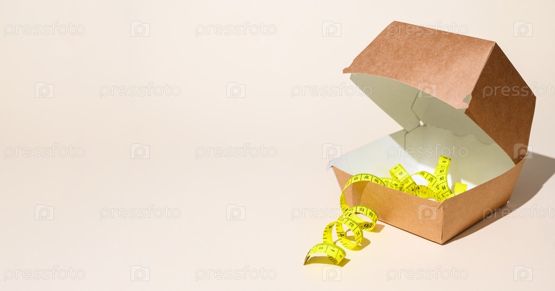 Концепция диеты и отказ от фаст-фуда. Измерительная лента и контейнер для гамбургеров на светлом фоне. Селективный фокус, пространство для копирования