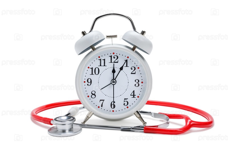 Будильник и стетоскоп на белом фоне. Понятие о своевременном медицинском осмотре