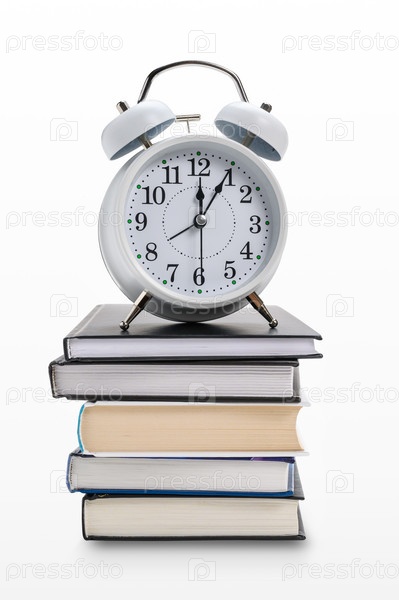 Будильник на стопке книг или учебников на белом фоне