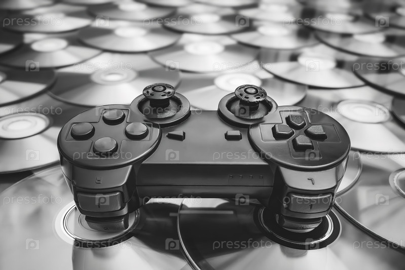 Старый изношенный джойстик от игровой приставки лежит на дисках с видеоиграми