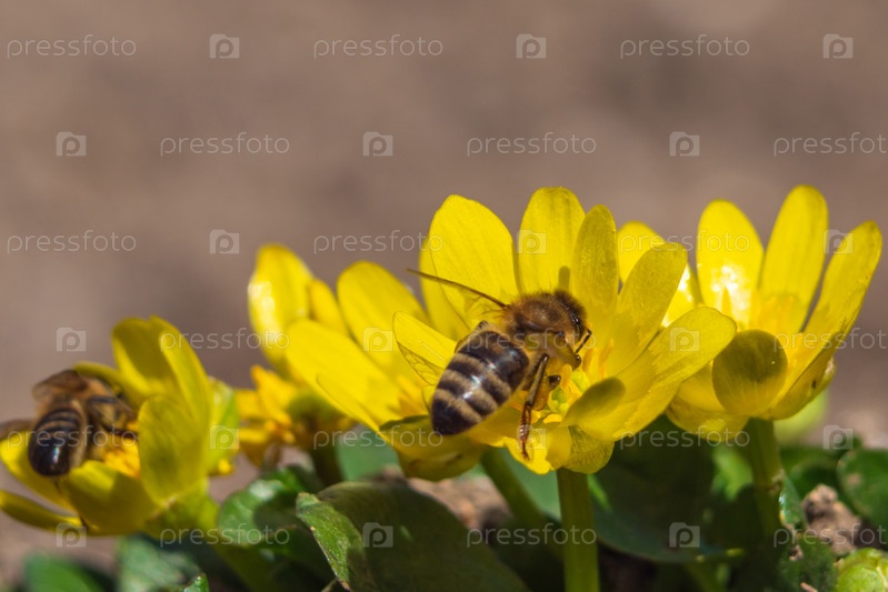 Ранней весной пчела сидит на желтом цветке. Пчелы собирают нектар на первых весенних цветах на открытом воздухе в парке