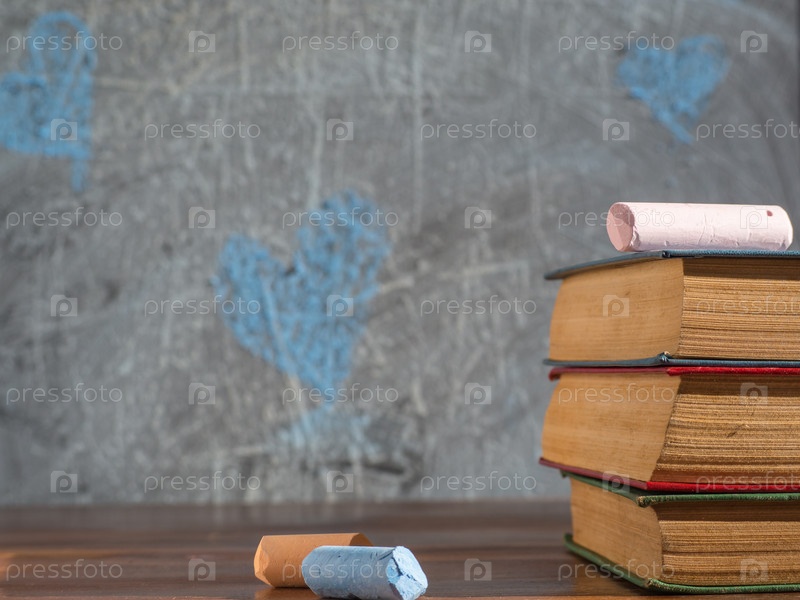 Школьные цветные меловые карандаши для письма и старые книги в твердом переплете на деревянном столе на фоне потрепанной окрашенной доски. образование, чтение, концепция возвращения в школу, место для копирования