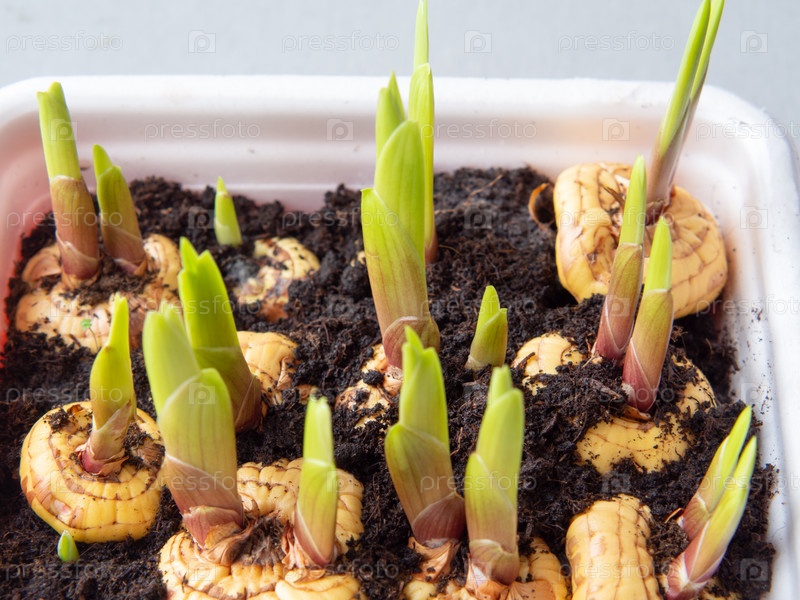 Крупный план цветочных луковиц с ростками. Проращивание луковиц гладиолусов перед посевом в грунт