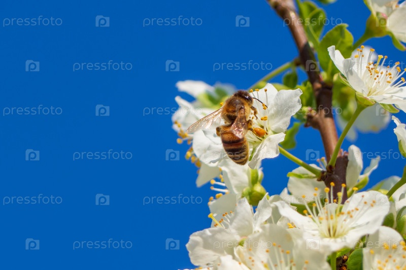 Макрофото пчелы, собирающей пыльцу на белых цветках вишни. Крупный план медоносной пчелы, собирающей нектар на цветке белой вишни