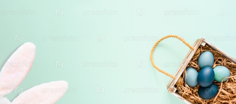 Деревянная коробка с пасхальными яйцами и кроличьими ушами на синем фоне. копирайт
