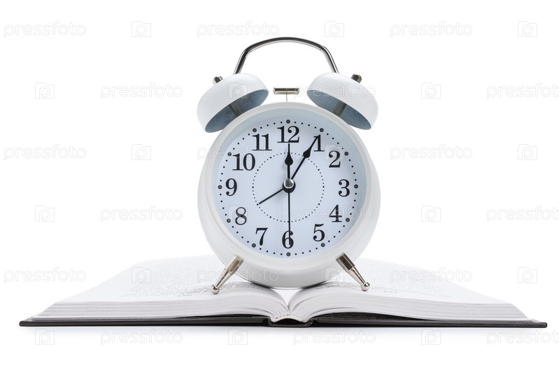 Будильник на открытой книге на белом фоне