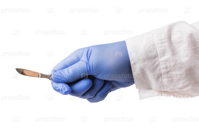 Рука хирурга держит скальпель на белом фоне, шаблон для дизайнеров