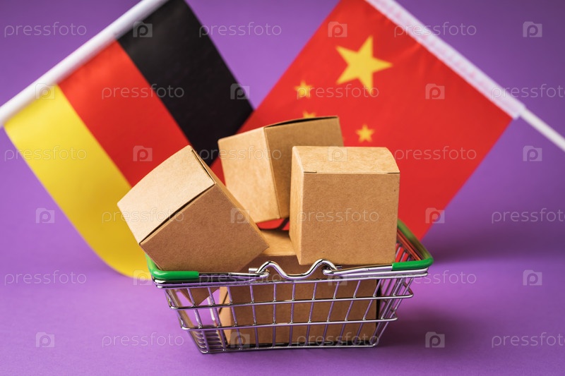 Картонные коробки в продовольственной корзине и флаги Китая и Германии на цветном фоне, концепция торговли между странами