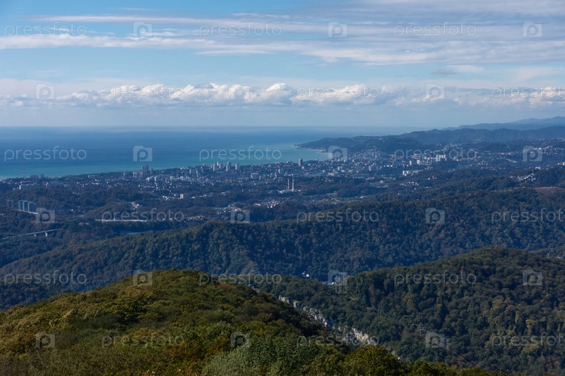 Вид на город, расположенный между морем и горами. Вверху кучевые облака, горный лес и столбы с электрическими проводами