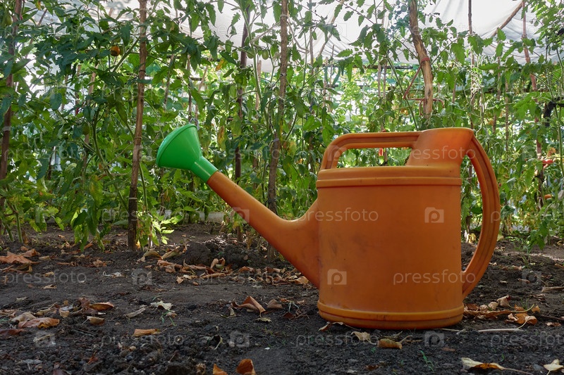 Оранжевая лейка для полива сада стоит на земле среди томатных кустов. Кусты укрыты белой тканью от палящего солнца