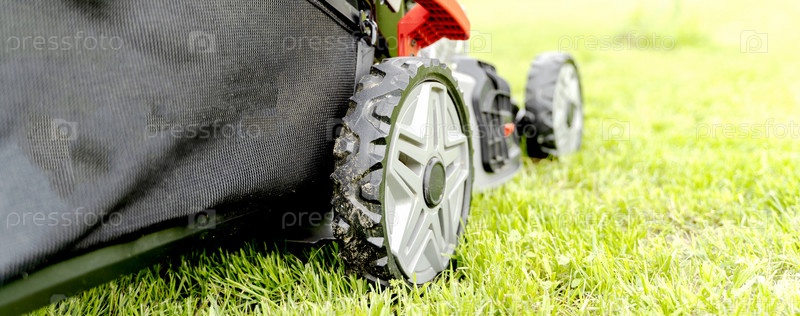 Газонокосилка на зеленой лужайке в лучах солнца