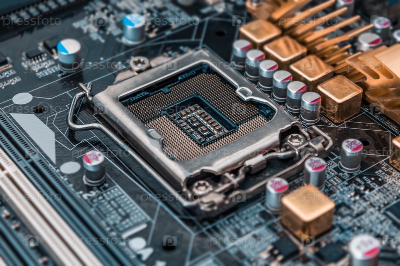Гнездо материнской платы, его микрокомпоненты и элементы электроники крупным планом