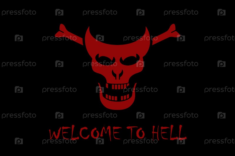 Стилизованный красный череп демона на черном фоне с надписью "Добро пожаловать в ад"