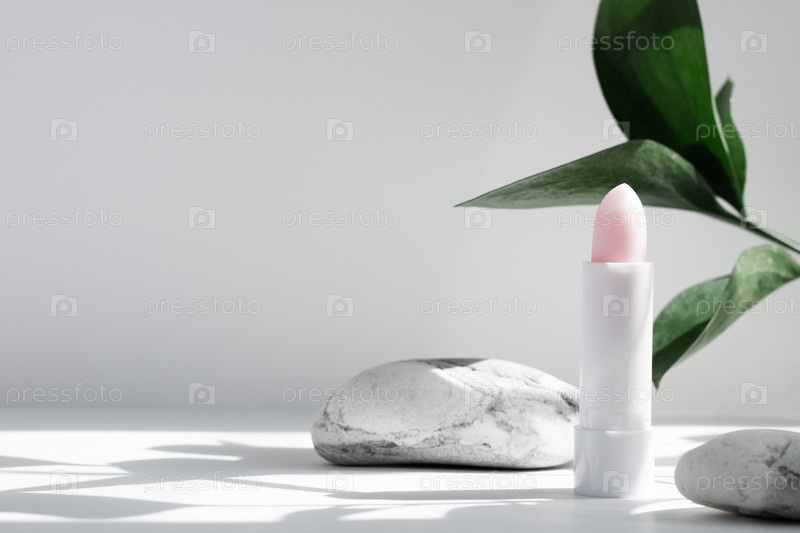 Уход за кожей губ. Крупным планом протектор губы помады на белом фоне, с тенью солнца. Концепция косметики красоты. Весенний или летний солнцезащитный крем или увлажняющая косметика
