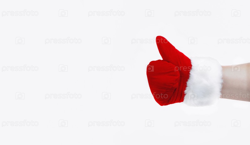 Фотография Санта-Клауса в перчатке на белом фоне, указывающая на жест. Пальцы. Эмоции. Концепция нового года и рождества. Копировать пространство