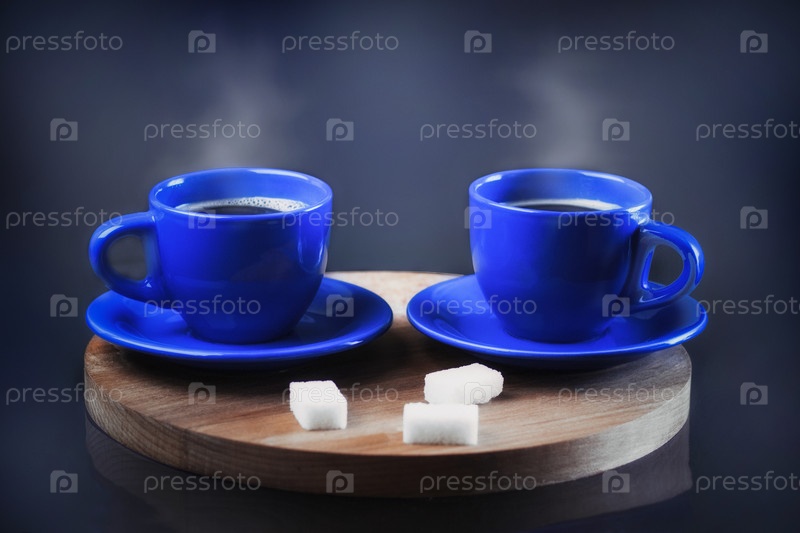 Две чашки свежего кофе на деревянной подставке. Синие кружки с горячим напитком на темном фоне рядом с сахаром