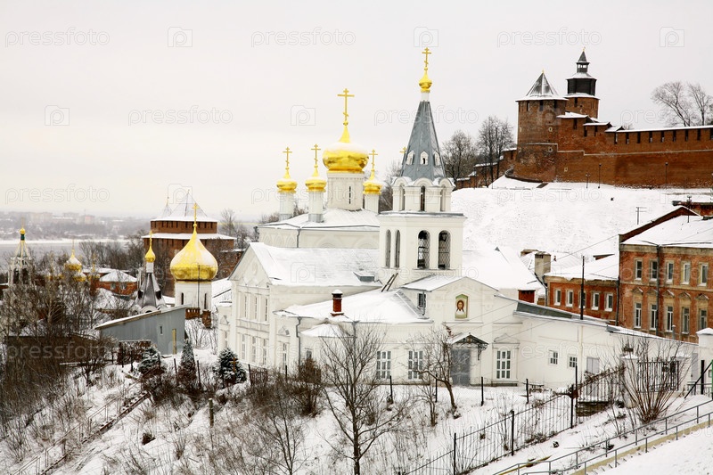 Зимний Нижний Новгород. Церковь Ильи Пророка на фоне Нижегородкого кремля