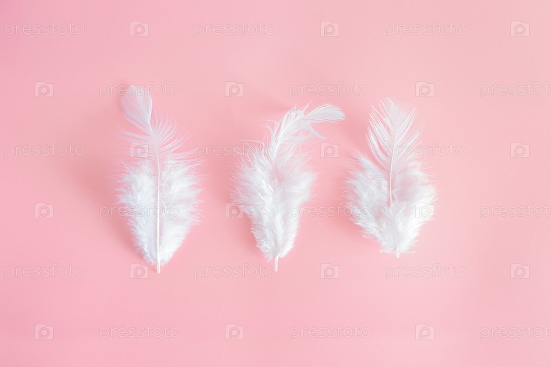 Белые пушистые перья лежат на нежном розовом фоне. В центре расположены мелкие пушистые белые перышки