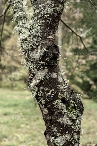 Фрагмент ствола дерева, покрытого мхом в парке усадьбы Михайловское