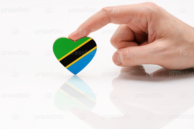 Флаг Танзании. Любите и уважайте Танзанию. Мужская рука держит сердце в форме флага Танзании на поверхности белого стекла. Концепция патриотизма и туризма