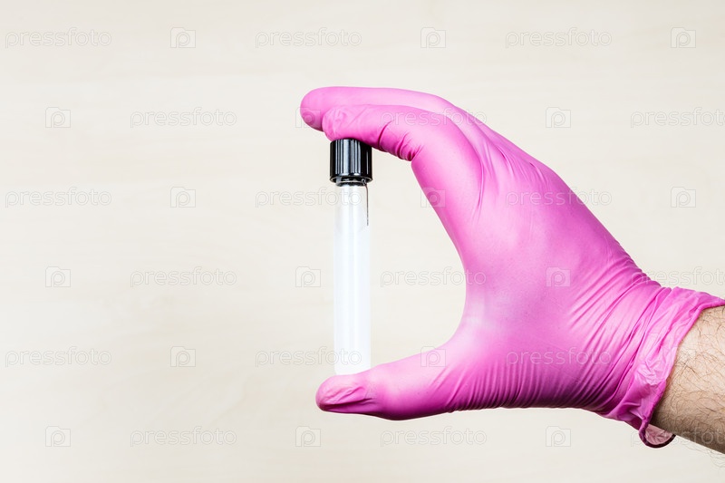 Рука в перчатке держит закрытую пробирку над столом