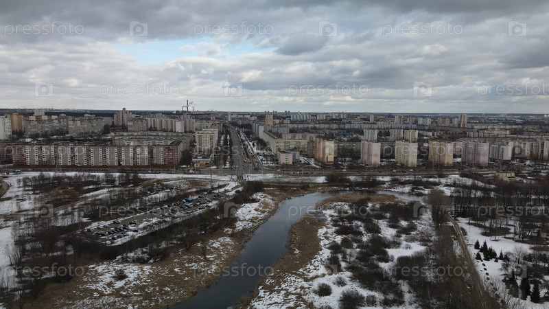 Зимний пейзаж города и реки в снегу в пасмурный день. Извилистая река в городском парке. Пасмурная погода. Аэрофотосъемка
