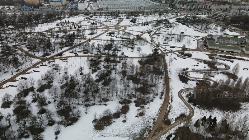 Извилистая велосипедная дорожка в городском парке. Городской парк зимой. Снег лежит на земле. Пасмурная погода. Аэрофотосъемка