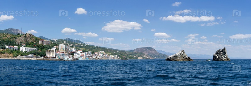 Вид на деревенскую скалу с моря на туристический центр и место отдыха