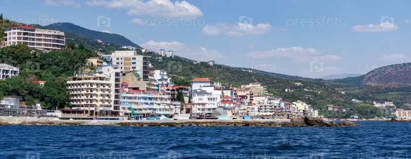 Вид на деревенскую скалу с моря на туристический центр и место отдыха