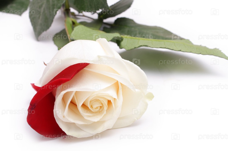 Белая роза и красный лепесток на белом фоне